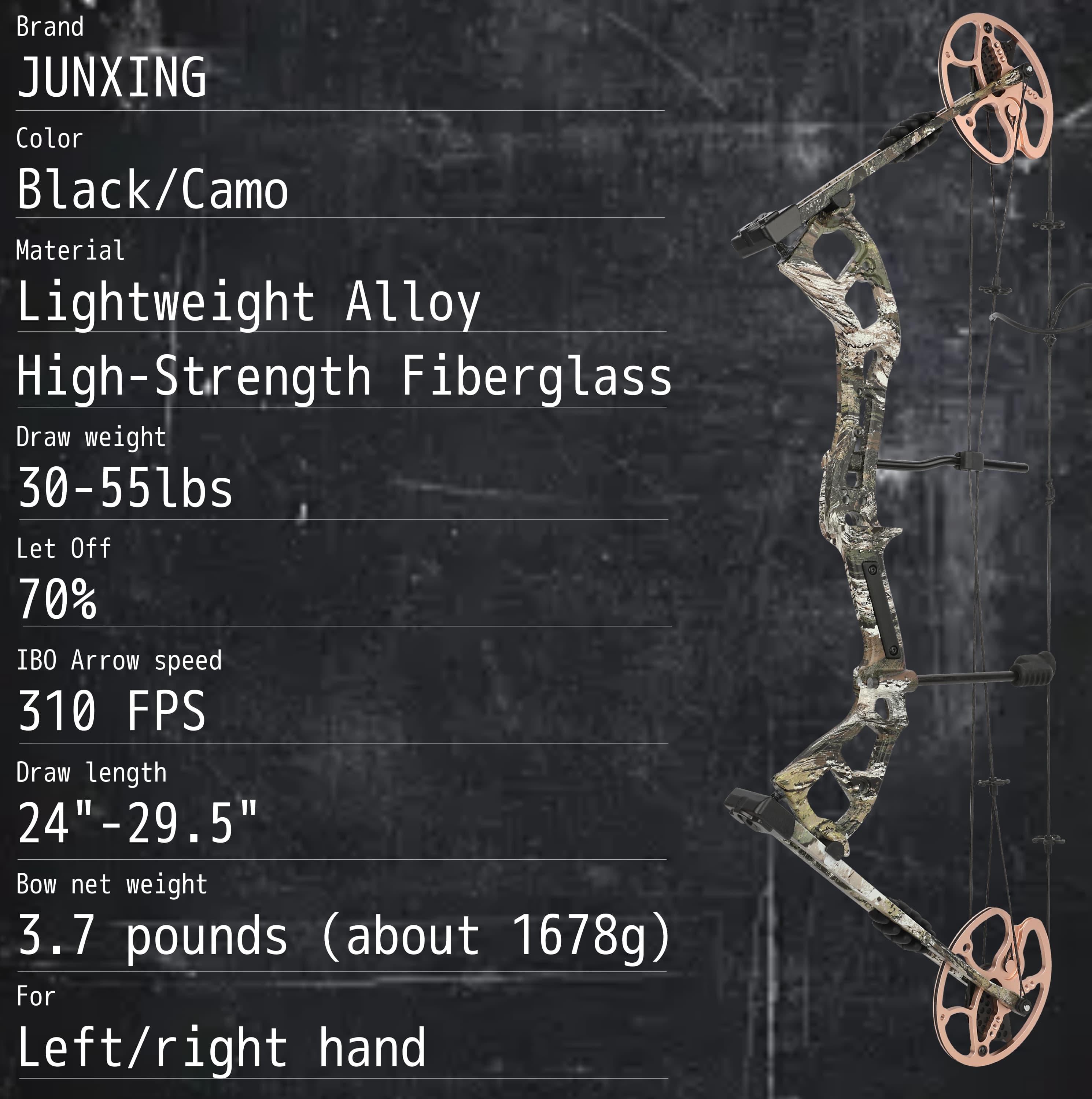 Draw weight: 0-70 lbs Adjustable