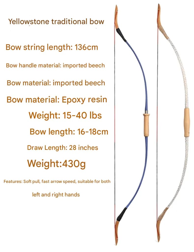 This traditional bow design combines functionality with a sleek, modern aesthetic. Designed using traditional craftsmanship, it features a flat limb, a leatherette limb, and a riser made of epoxy resin rods and imported beech wood. It is both durable and lightweight, making it an ideal choice for archers of all levels.