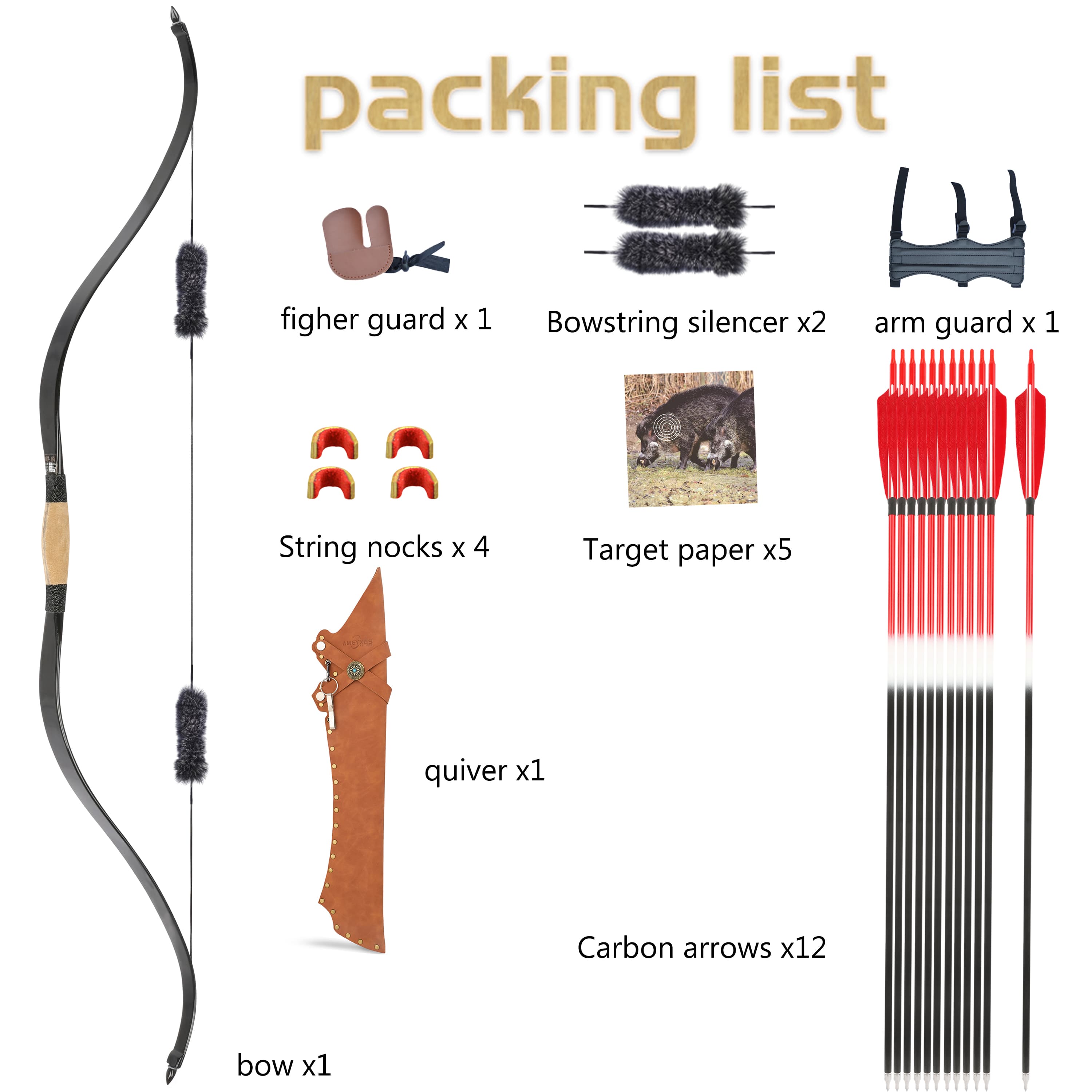 1x Traditional Bow, 12x Wooden Arrows, 4x String Nocks, 1x Arrow Quiver, 1x String Dampener, 1x Finger Guard, 1x Arm Guard, 3x Target Papers