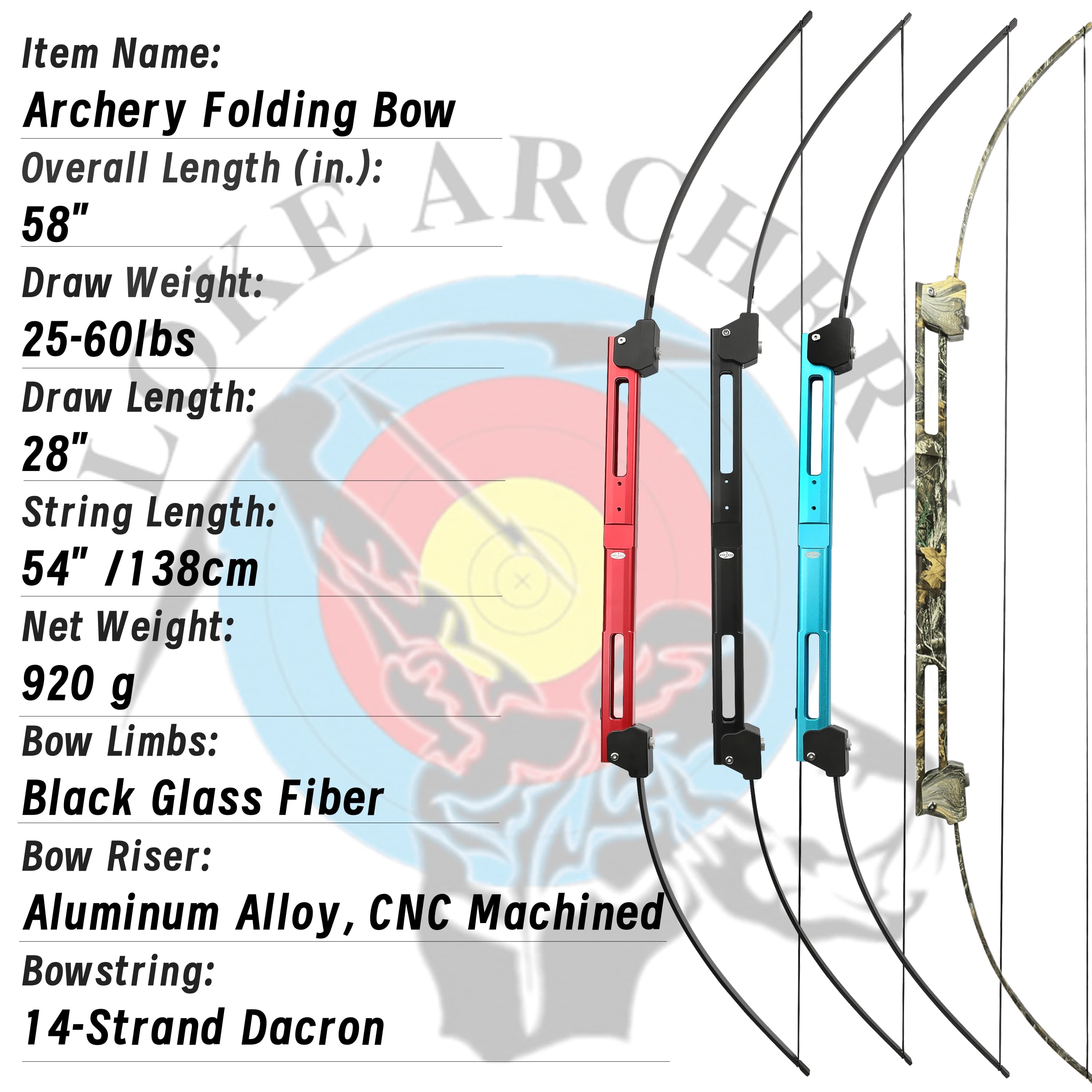 The Folding Bow combines portability with performance. Featuring a CNC-machined aluminum alloy handle and a black fiberglass bow piece, it delivers a 35-pound draw weight at 28 inches. The included 14-strand, 137cm bow string ensures consistent shooting. When folded, it compactly stores at 60.07 x 6 x 4 cm. Weighing just 953.4g (1,148.9g packaged), it is both durable and easy to carry.