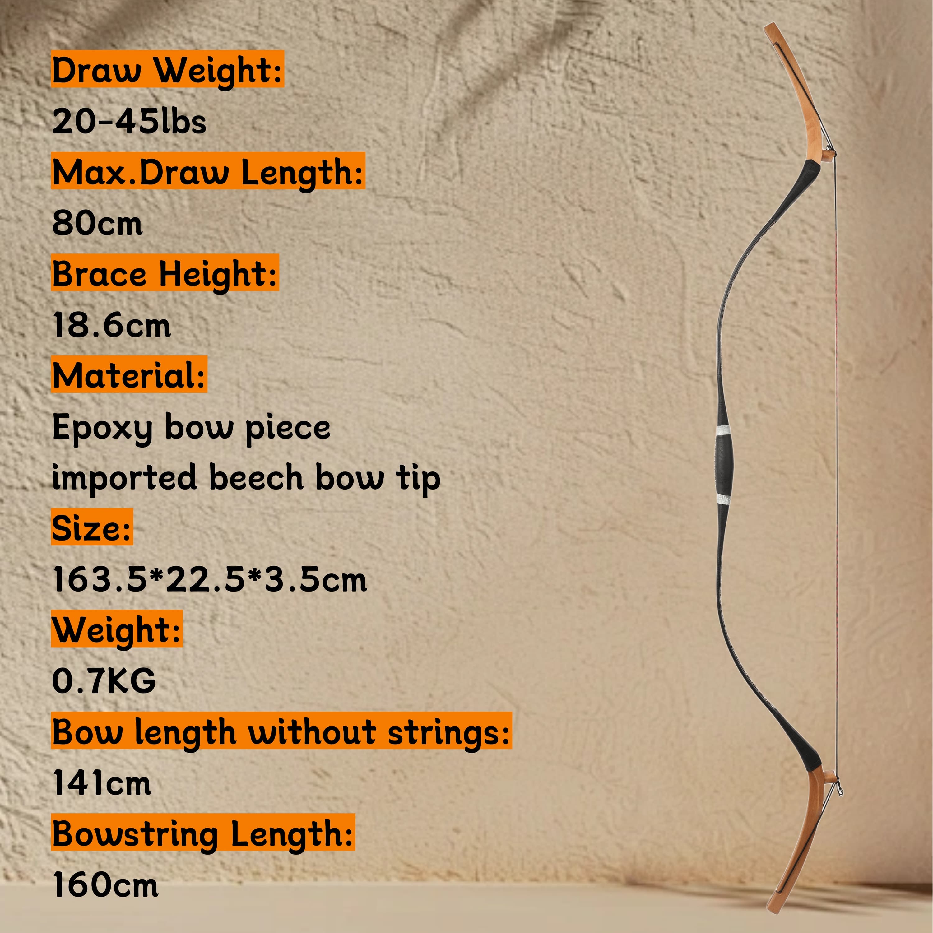 A modern take on the classic longbow, expertly crafted with epoxy limbs and imported beechwood tips for exceptional durability and a smooth shooting experience. With a versatile 20-45 lb draw weight range and an ultralight 0.7 kg build, it offers the perfect balance of traditional aesthetics and contemporary performance for target archery and field shooting.