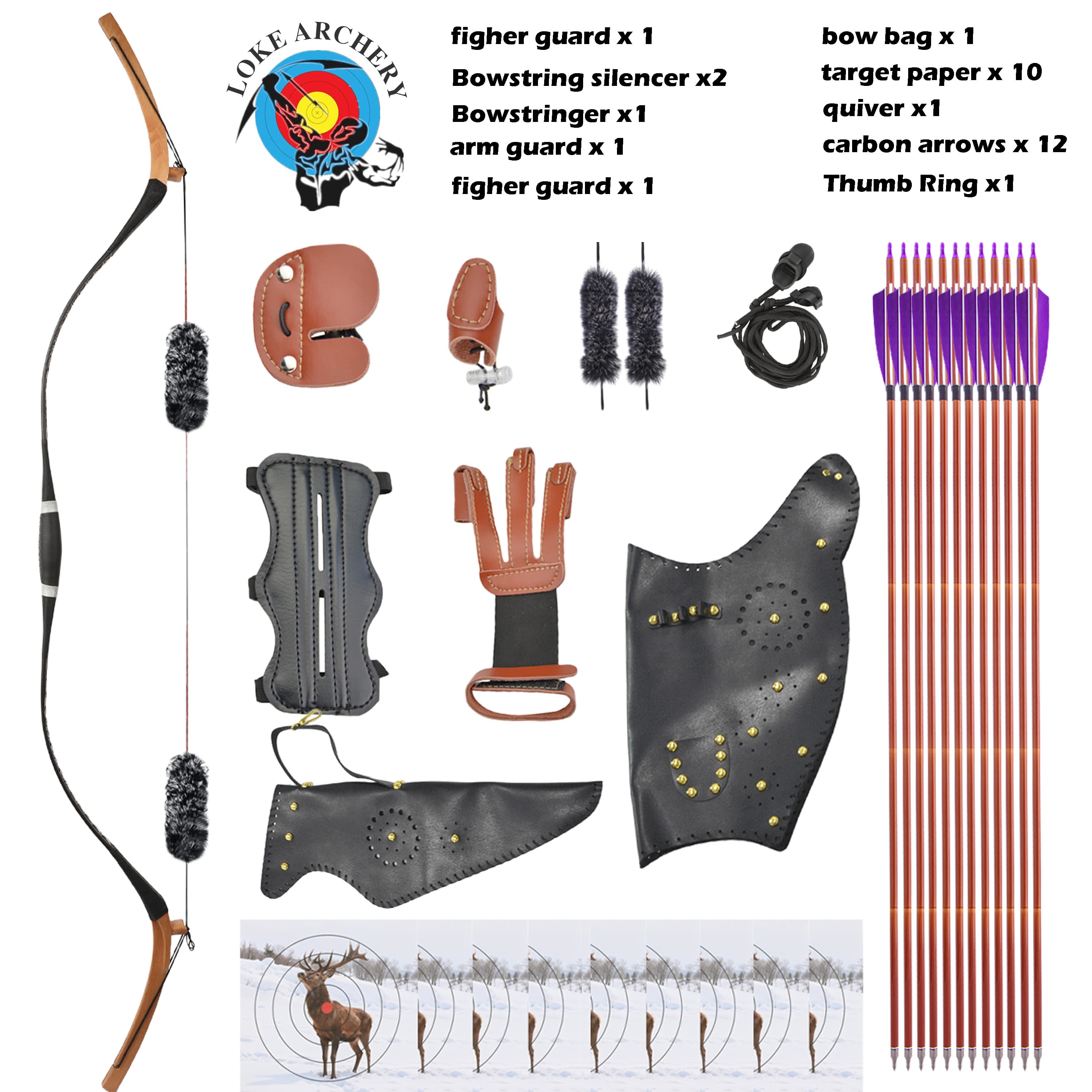 ✅ Complete Traditional Archery Kit: Provides everything needed to start shooting immediately, including a full set of carbon arrows, protective gear (arm guard, finger guards, thumb ring), and essential accessories like a stringer and silencers.