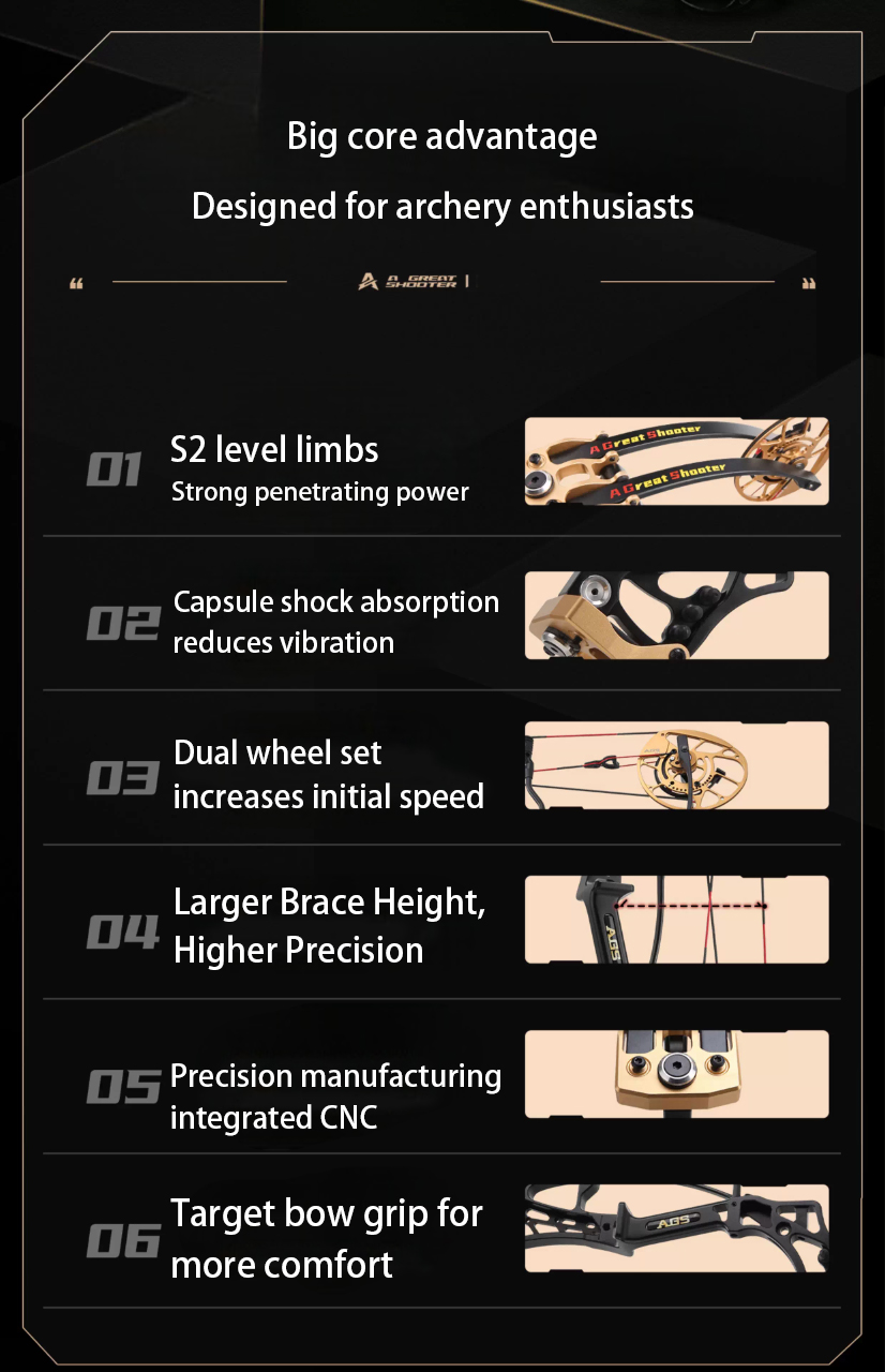 Adjustable Let-off gear, you can choose 60%/70%/80% Let-off at will, and get a comfortable and personalized shooting experience.