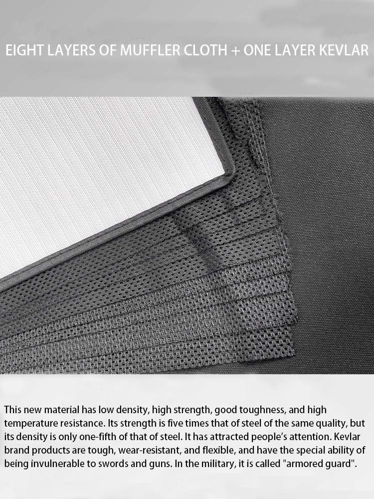 The interior is made of eight layers of silencer cloth and Kevlar cloth, which is indestructible, has low density, high strength, good toughness and high temperature resistance. It is called "armored guard" in the military.