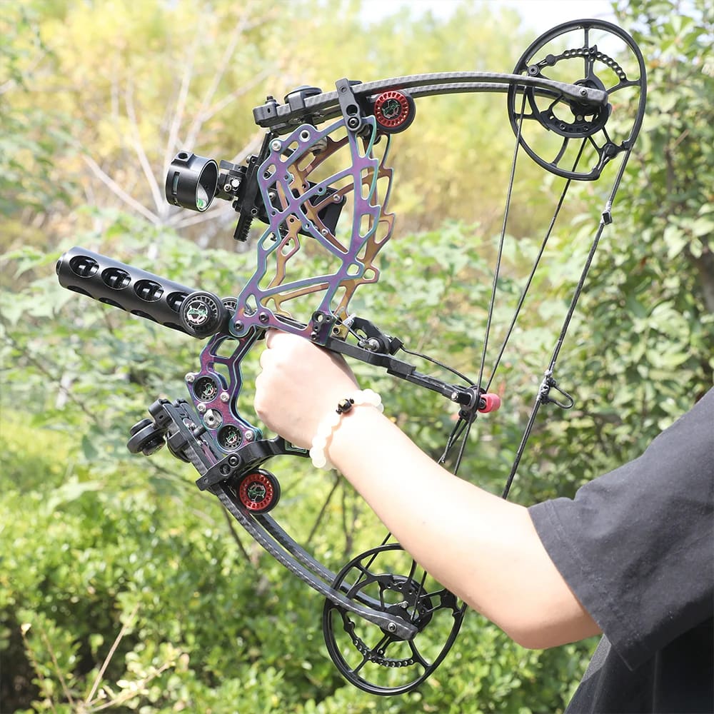 The Alien steel ball compound bow is made of durable titanium alloy for long-lasting durability. With an eye-catching quenched color finish, it is powerful and beautiful, and the hollow grip design minimizes deadweight and maximizes the archer's repeatability. The equipped riser and bow arm shock absorption system allows the archer to experience comfortable shooting without vibration. Perfect for bow fishing, bow hunting and other fun!