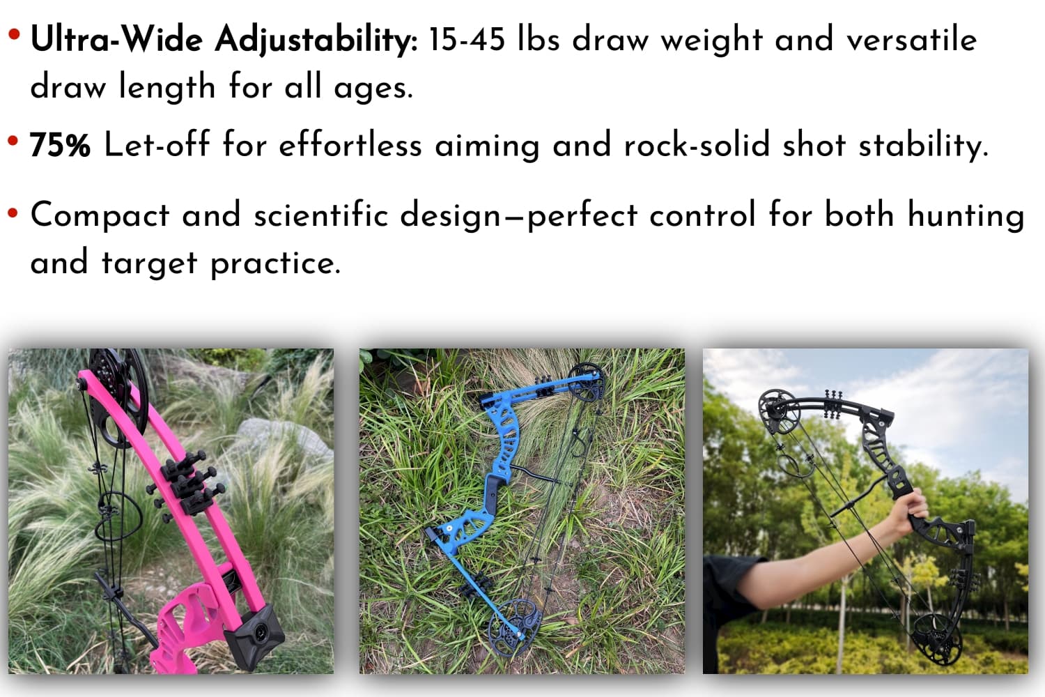 ✅Comfortable and Efficient: The 75% let-off reduces the amount of force needed to hold the string at full draw, making shooting much easier for younger archers.