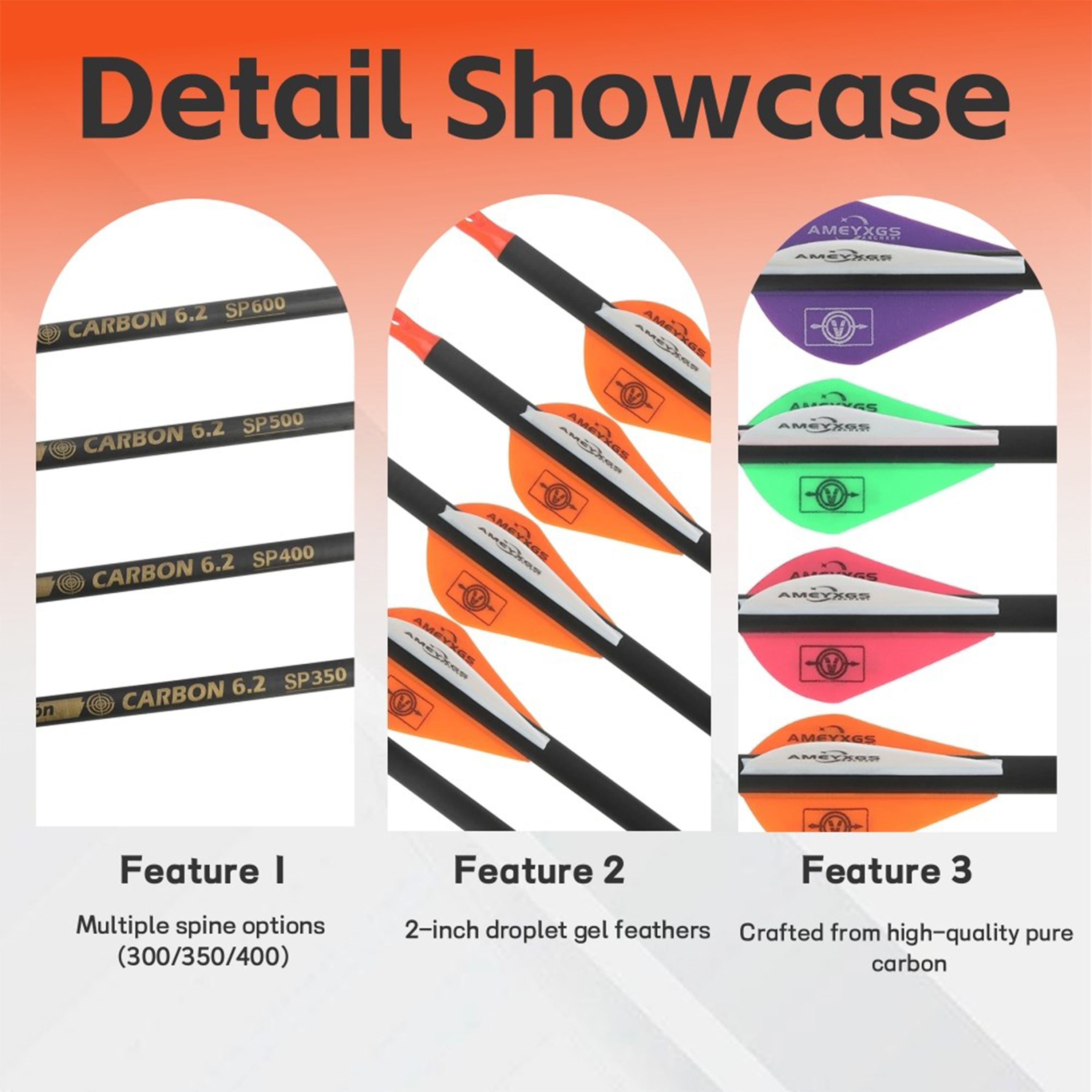 - 1.Crafted from high-quality pure carbon, the arrow shafts offer exceptional straightness and durability, minimizing deformation during flight for reliable performance.