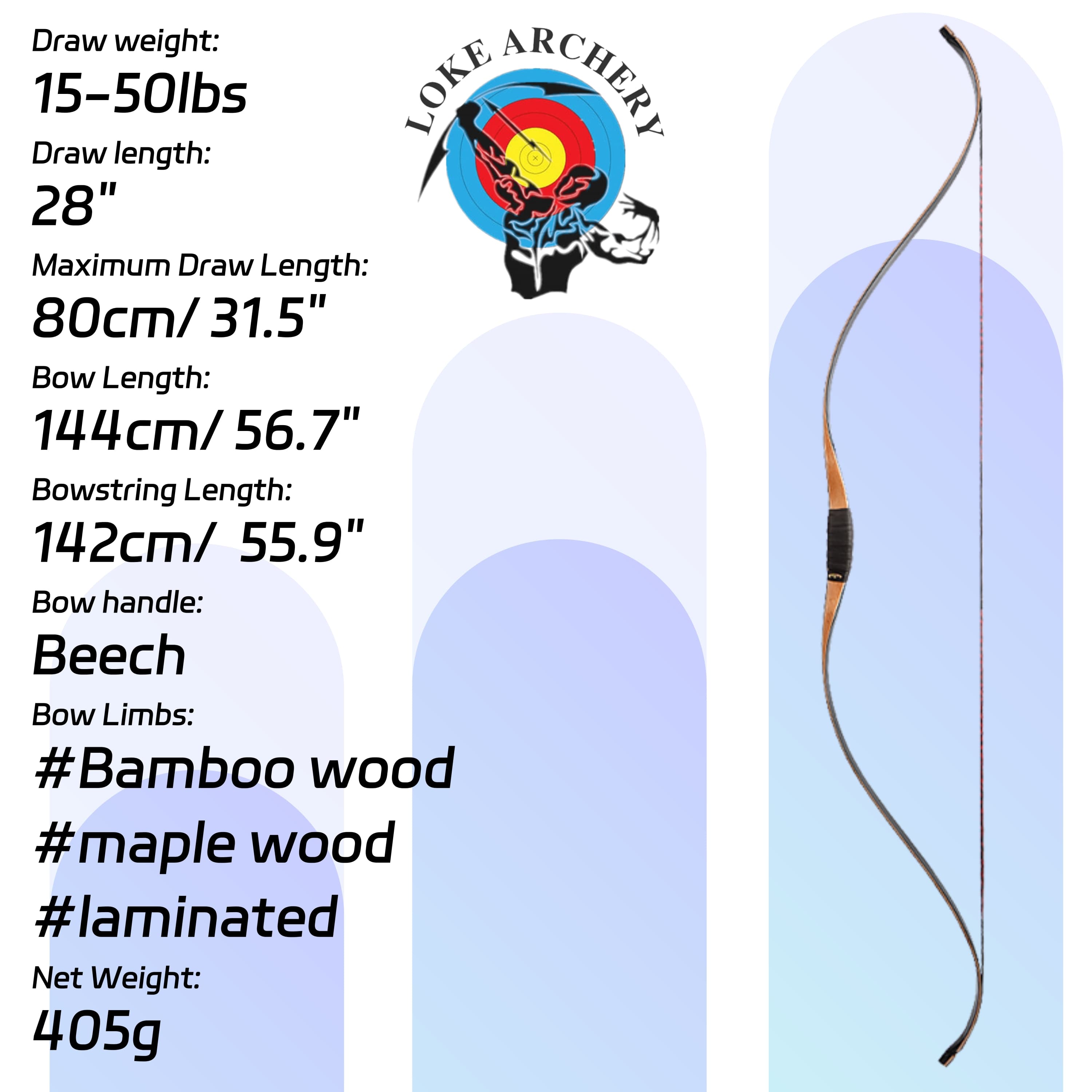 Lightweight Materials for Portability and Ease of Use: A net weight of only 405 g, combined with limbs laminated from bamboo and maple wood, ensures sufficient strength and elasticity while significantly reducing overall weight, making it easy to carry and comfortable for extended use.