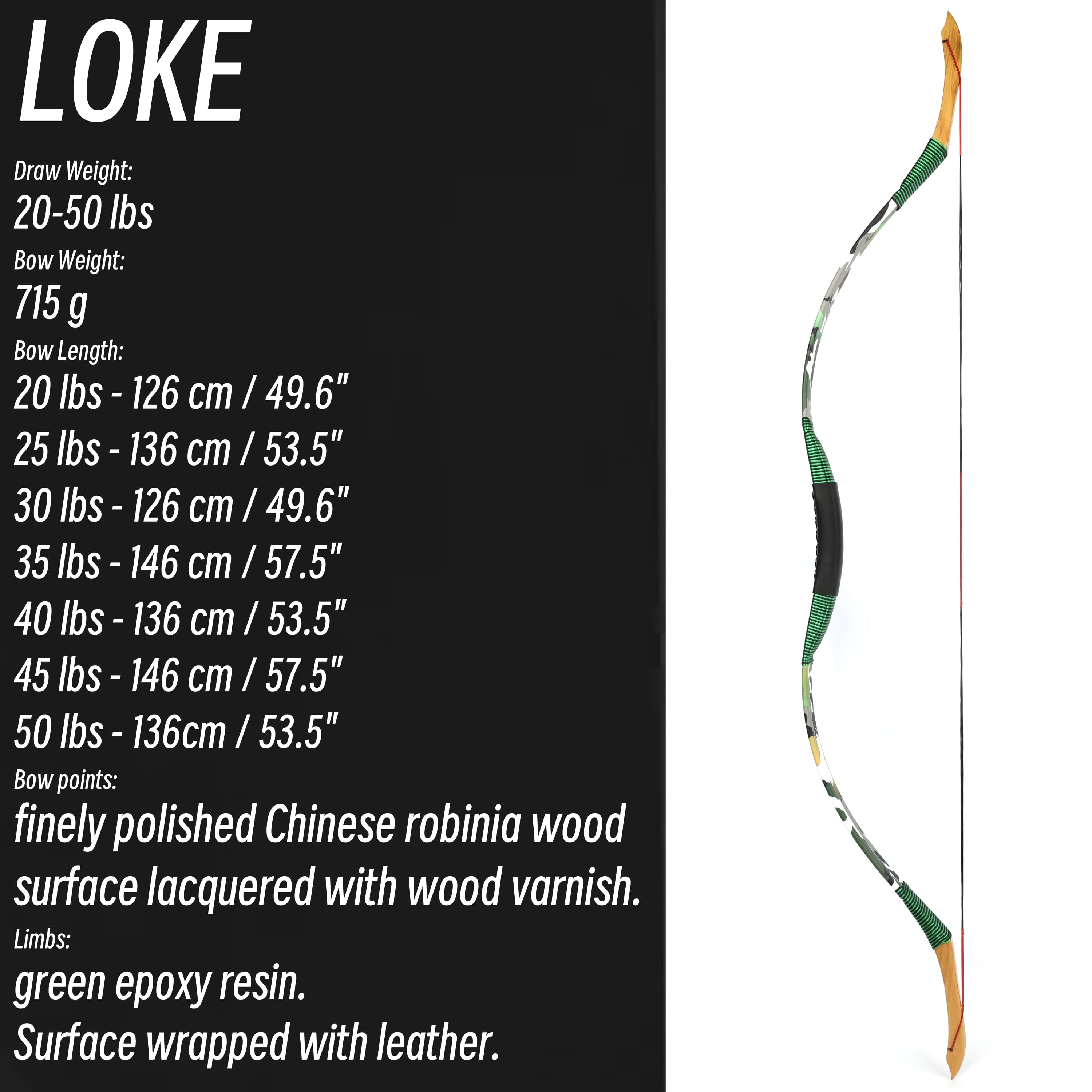 Bow Length: Varies by draw weight (126 cm / 49.6" to 146 cm / 57.5")
