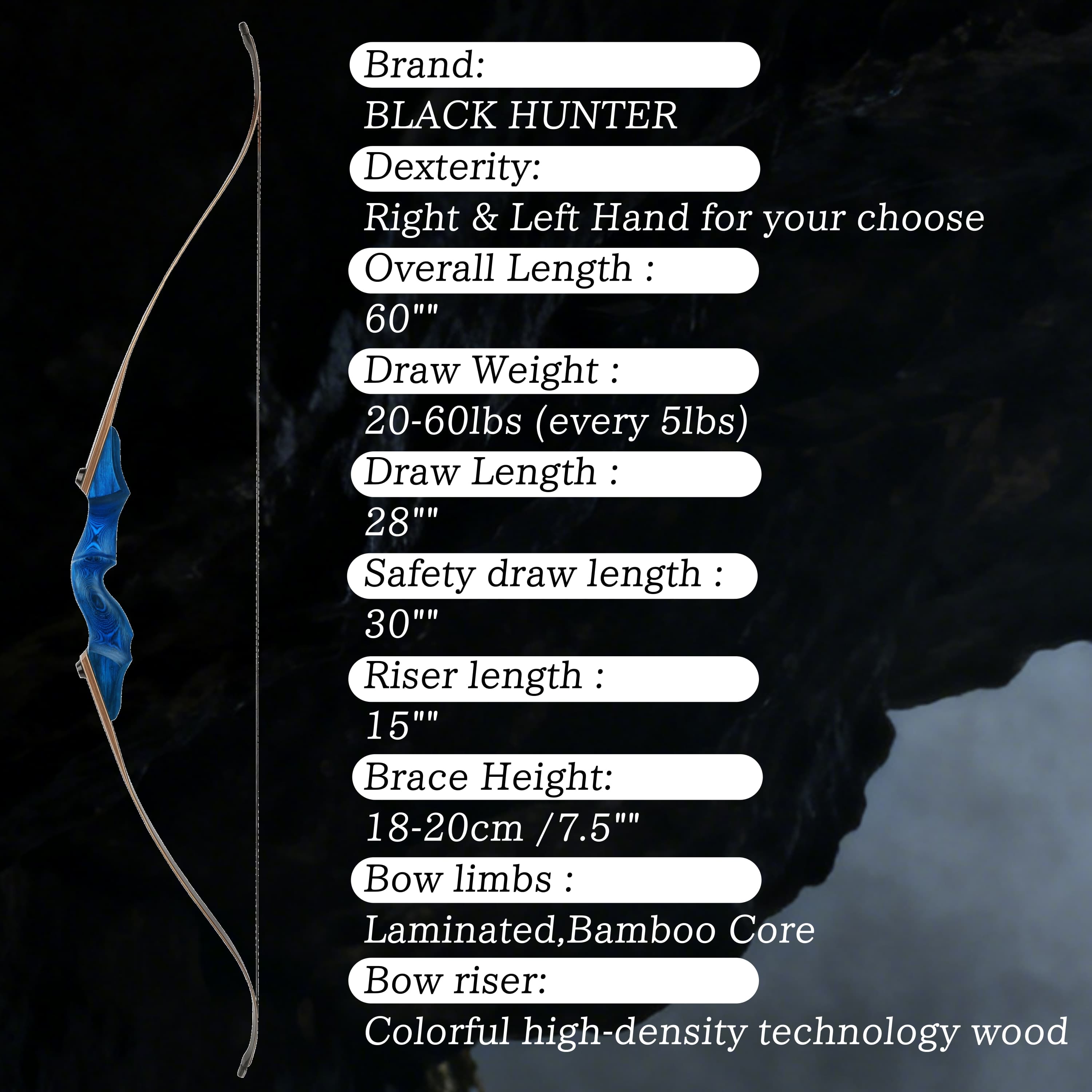 The Black Hunter is a purpose-built takedown hunting recurve, combining a rugged high-density wood riser with laminated fiberglass-bamboo limbs for quiet, powerful performance in the field. With a wide 20-60 lb draw weight and a compact 60" length, it's engineered for hunters who demand reliability, smooth shooting, and easy transport.