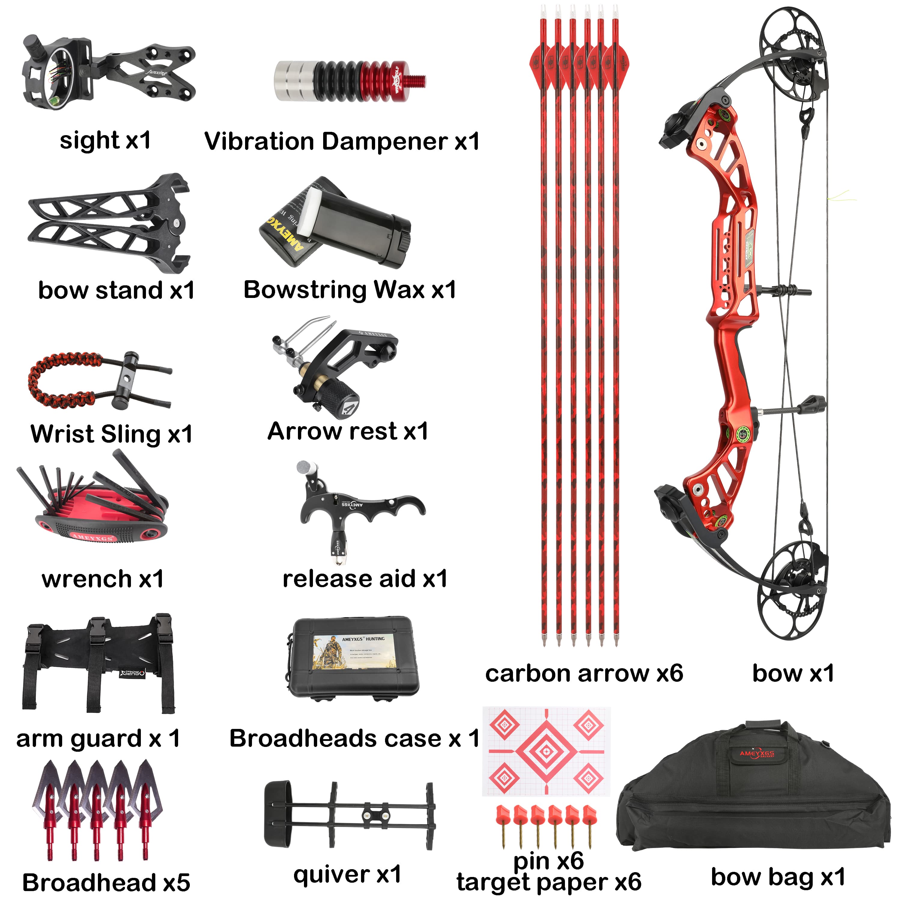 Complete Bow Set: 1 x Compound Bow (Red), 6 x Carbon Arrows, 6 x Field Points, 6 x Nock Protectors (Red) 1 x Bow Sight, 1 x Stabilizer, 1 x Arrow Rest, 1 x Quiver 1 x Release Aid, 1 x Wrist Sling, 1 x Arm Guard, 1 x Bow Stand 1 x Bow Case, 1 x Bowstring Wax, 1 x Allen Wrench Set, 1 x Paper Targets, 1 x Accessory Box
