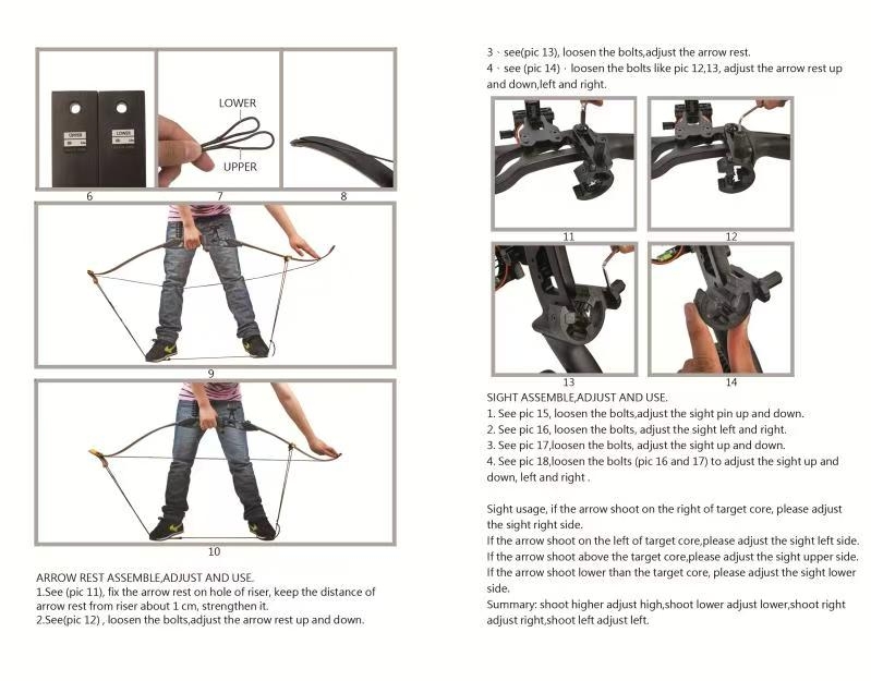 • Accessories: 1×arrow rest + 1×shock absorber + 1×arm guard + 1×finger guard + 1×string wax + 1×sight + 1×bow bag + 6×carbon arrows + 5×target paper