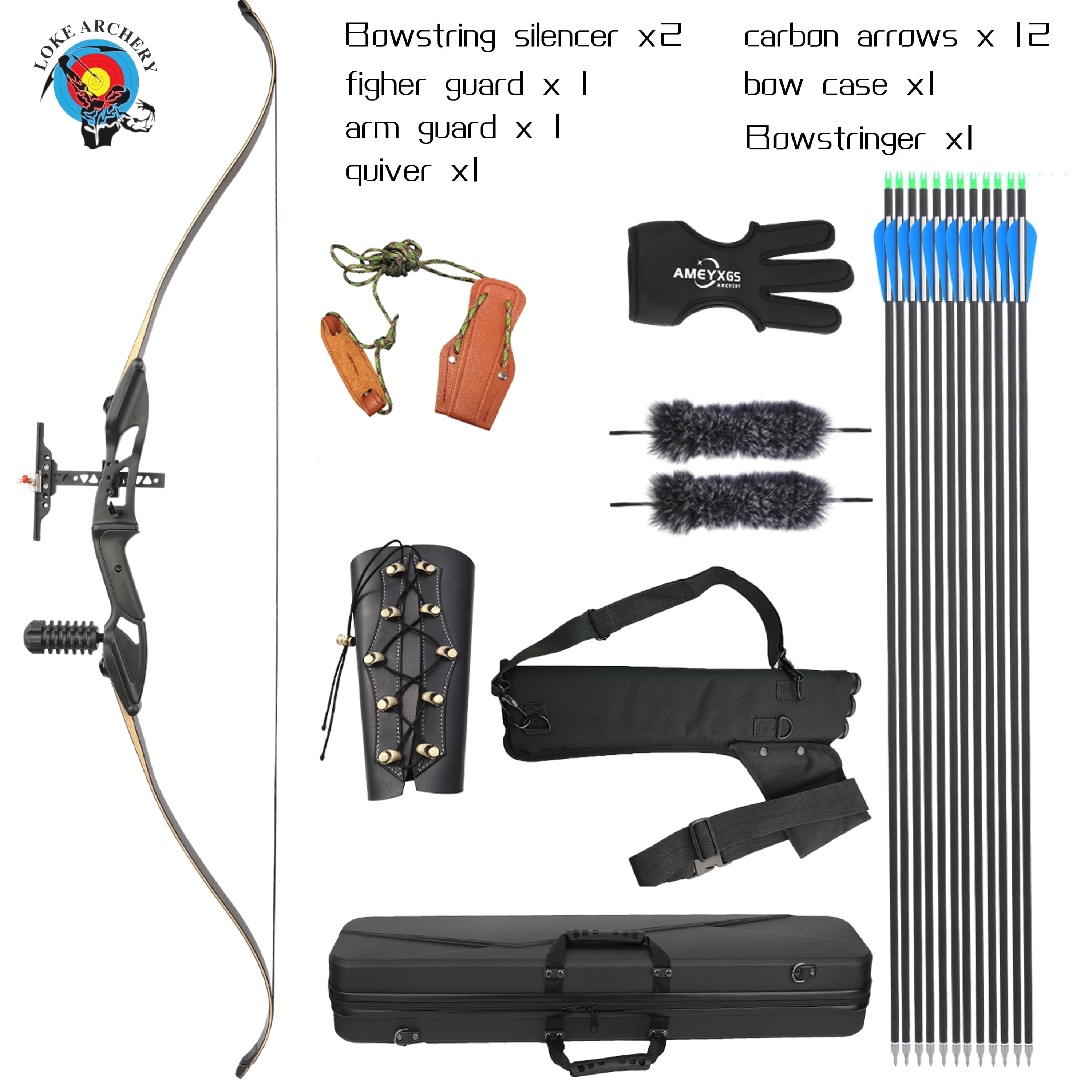 Bow Set: 1 x F179 hunting recurve bow, 1 x Finger Tab, 1 x Arm Guard, 12 x Carbon Arrows, 1 x Bow Case, 1 x Quiver, 1 x Bow stringer, 2 x String silencers
