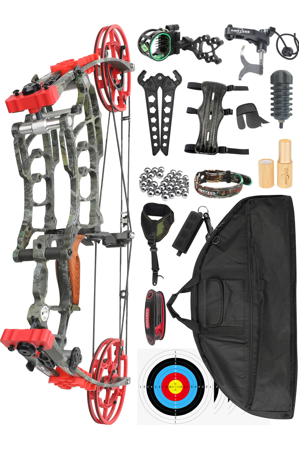 - Accessories: 1× sight + 1× arrow rest + 1× bow stand + 1× arm guard + 1× finger guard + 1× shock absorber + 1× wrist rope + 1× string wax + 1× wrist release + 1× arrow glue + 1× wrench + 5× target paper + 1× bow bag + 20× steel balls
