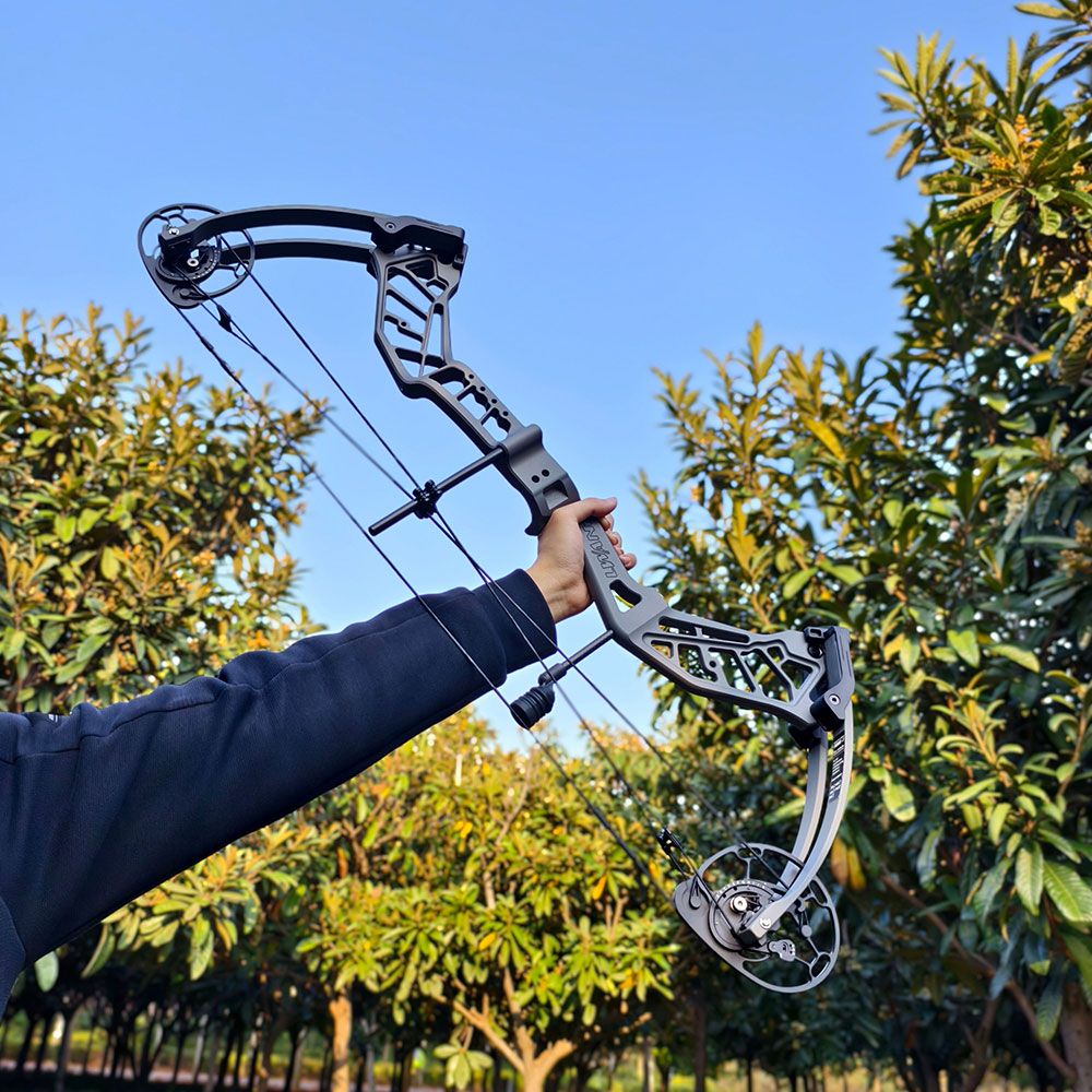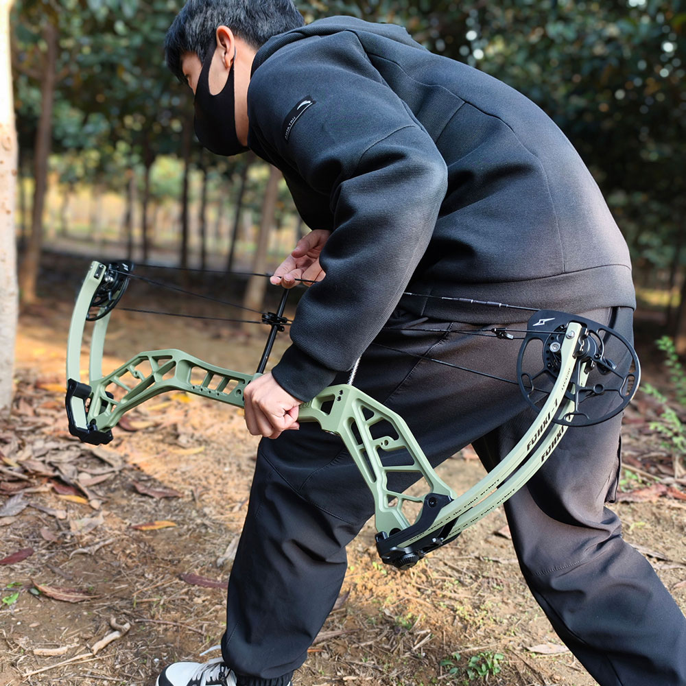 Lwano Fuxi Compound bow is made of CNC 6061-T6 aluminum alloy, which is stable and strong. The surface adopts the new process of powder spraying and oil spraying, and the finished product feels delicate. The double wheel set has the advantage of center shooting, and the bow has a patented Y-type steel cable adjustment system. To adjust the camber state of this wheel set, there is no need to use a bow presser, just use a wrench to control the left and right adjustment, which reduces the deflection of the arrow path and improves accuracy.