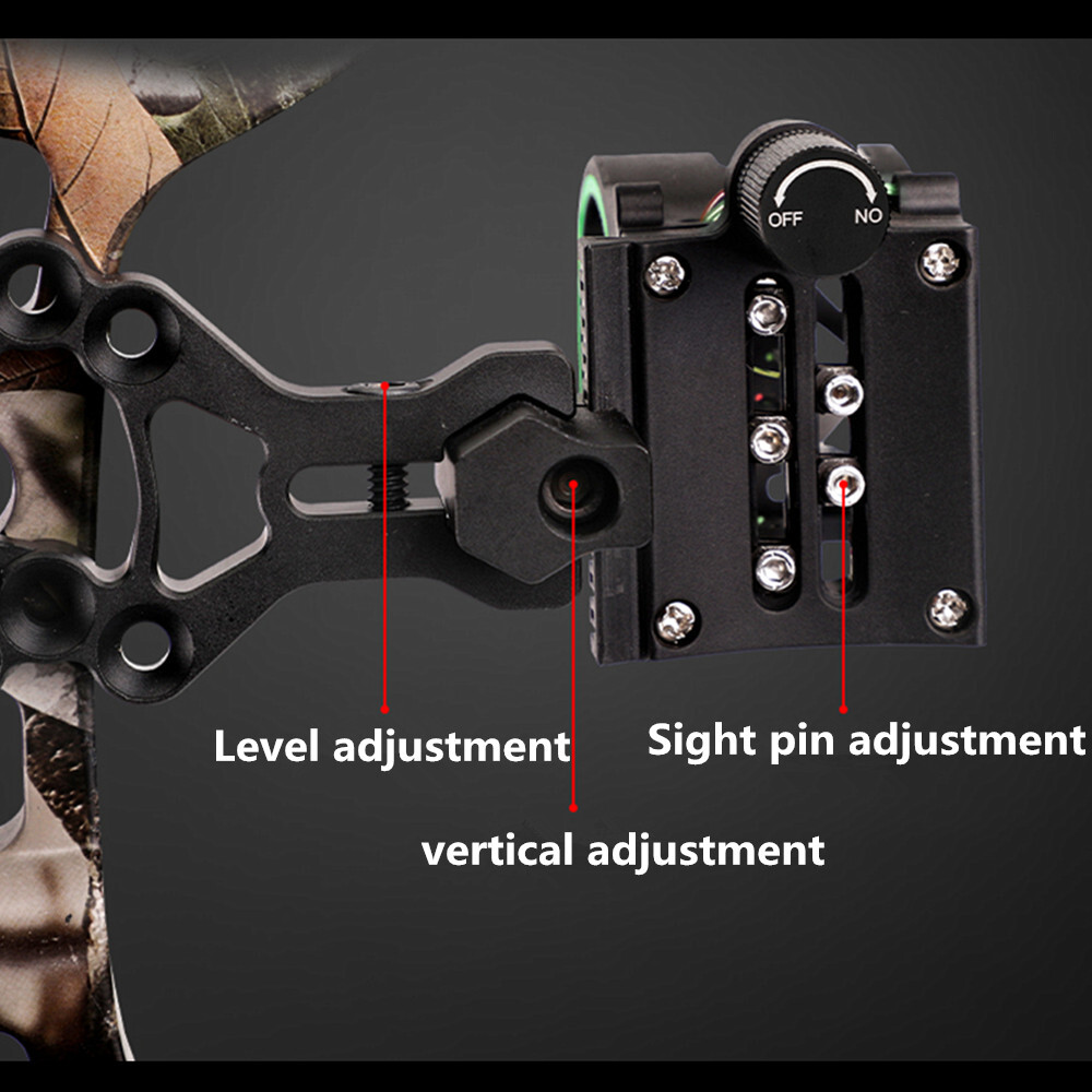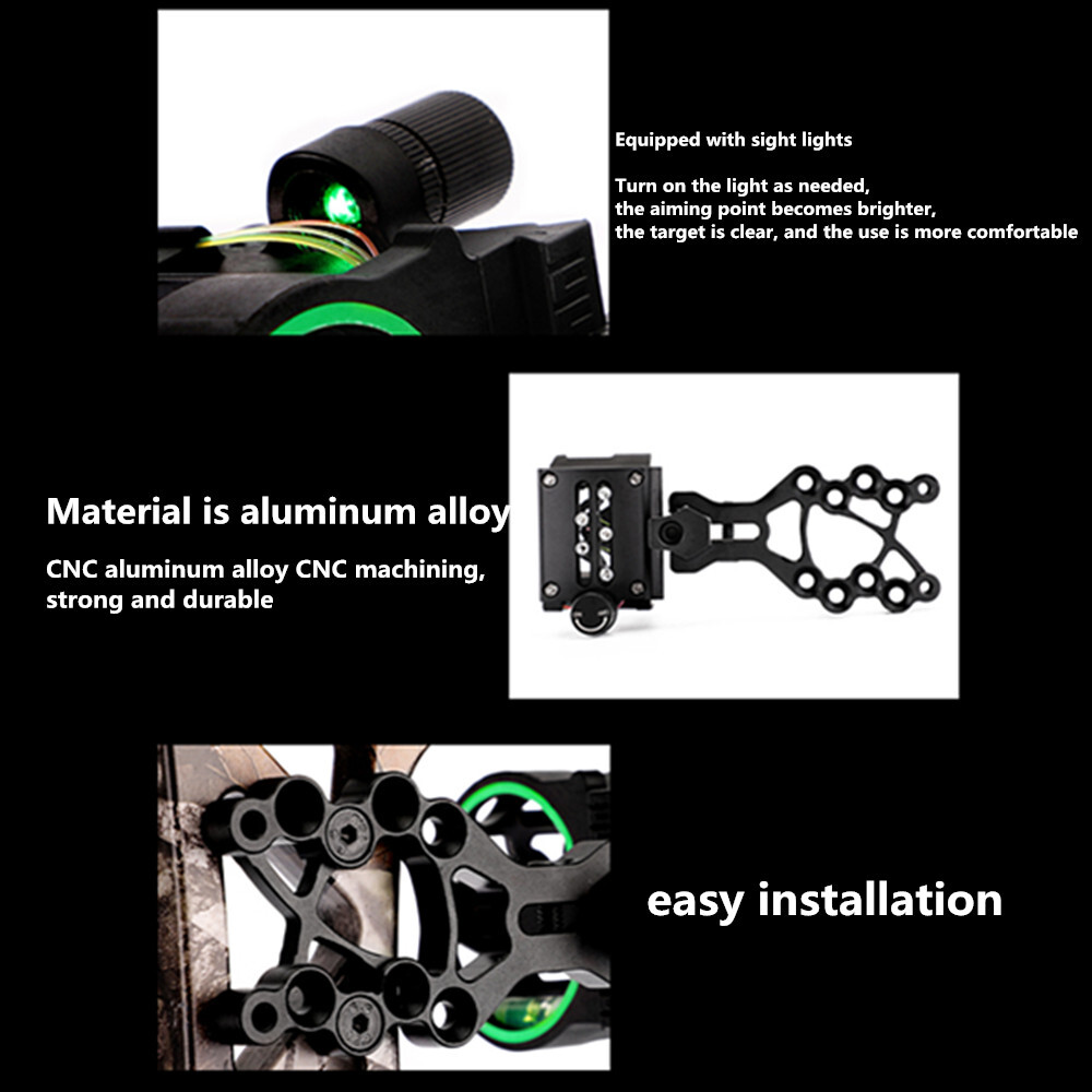 The Lwano M1 5-pin sight body is made of aluminum alloy with low density, high strength and hardness, and is CNC machined for maximum precision. 019-inch horizontal fiber optic pins, maintain visibility in low and changing light, simple structure, easy to install and remove, reversible installation design, suitable for both left-handed and right-handed bows.