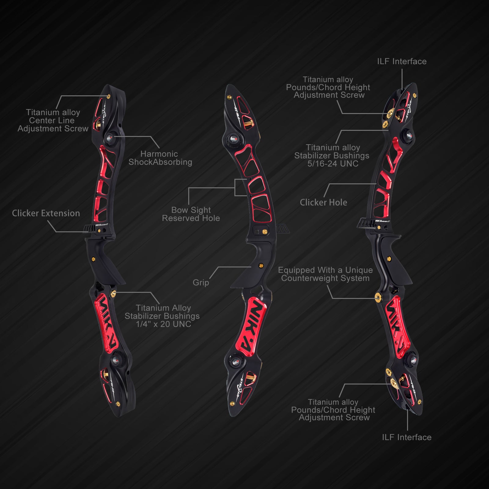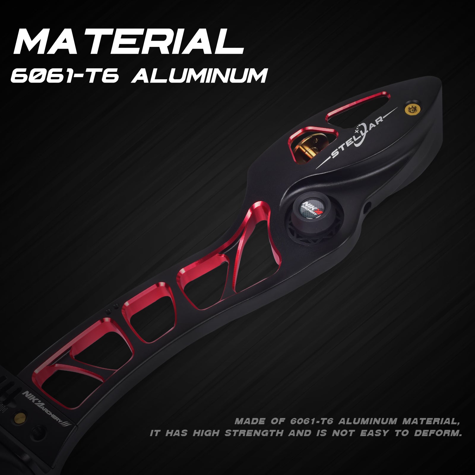 Nika Stellar bow handle is made of 6061-T6 aluminum, which is high in strength and not easy to deform. It is manufactured by CNC machine tools to ensure high precision and avoid unnecessary errors. All screw accessories are made of titanium alloy, which is light, beautiful, corrosion-resistant and high in strength.