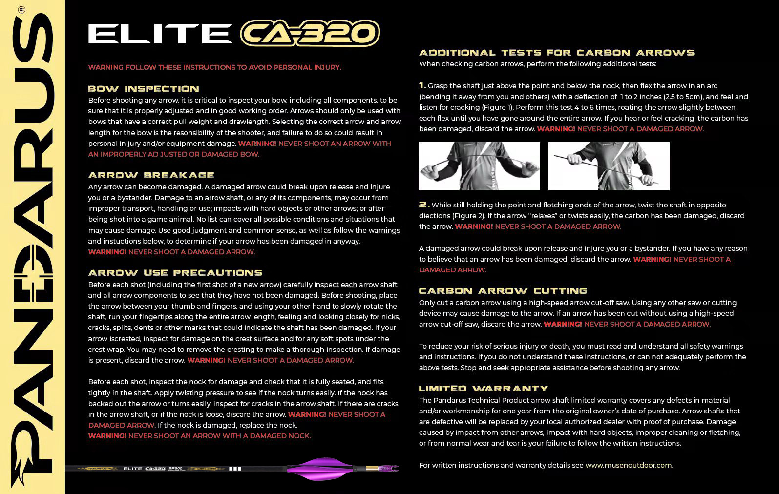 Pandarus CA320 is an evolutional version of ELITE XT designed for Olympic target shooting, barreled shape based on CAC construction offering the competitive shooter exceptional speed and accuracy with little worry of wind drift, it’s almost an unfair advantage compare with any other pure carbon arrows, taper tail providing the incredible clearance and release forgiveness, it can provide the strong and stable output, it’s the ulitmate arrow for long distance targeting shoot.