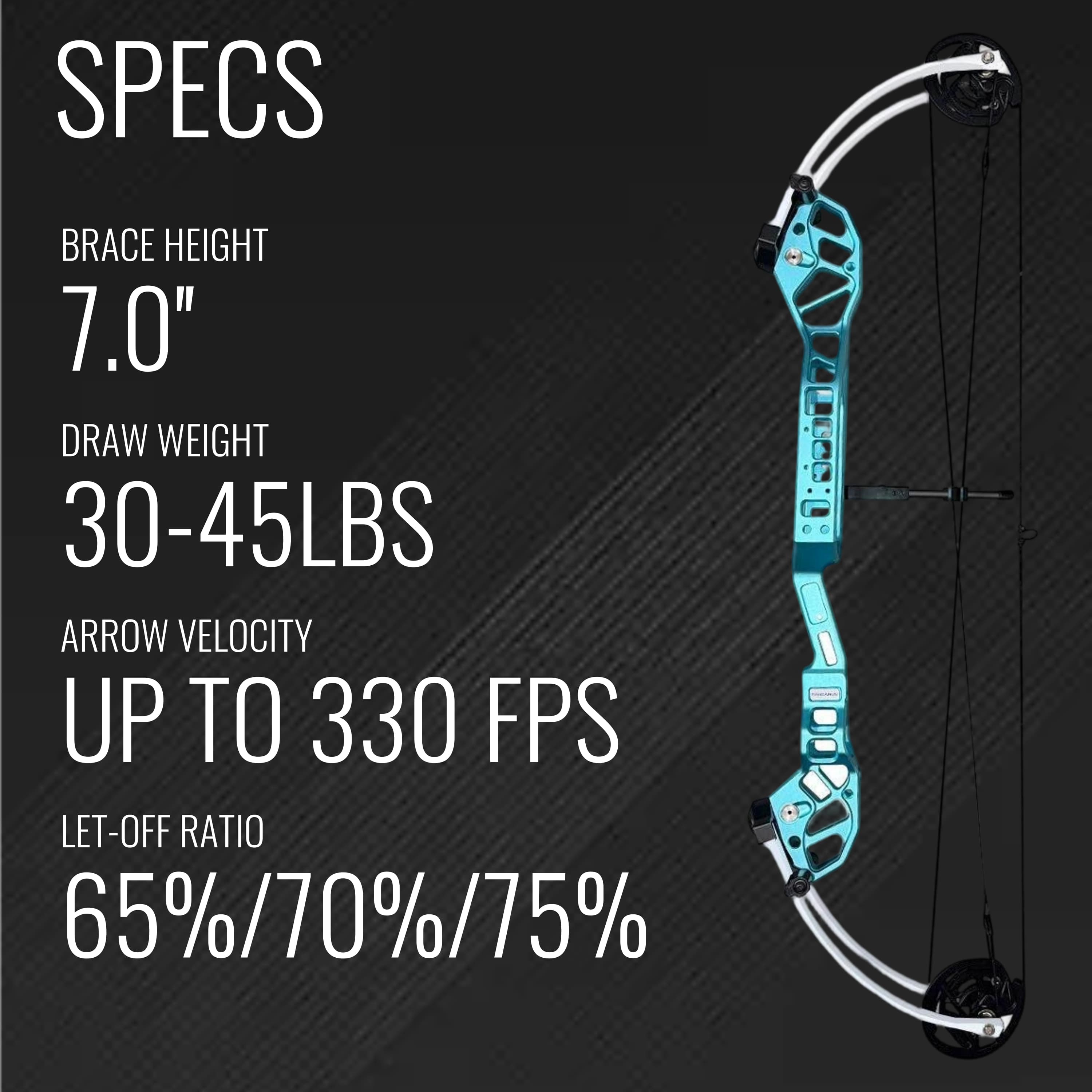 Size::S1 Alex to alex:331/2 Brace height:7.0 Draw weight:30-45LBS Draw length:26.00"-27.25"NO.1 23.75-25.75NO.2 Arrow speed:upto330 Let off:65%/70%/75% Bow body:6061 Cam:7075 Bow string material:454/452x/x99 Bow net weight:3.88BS