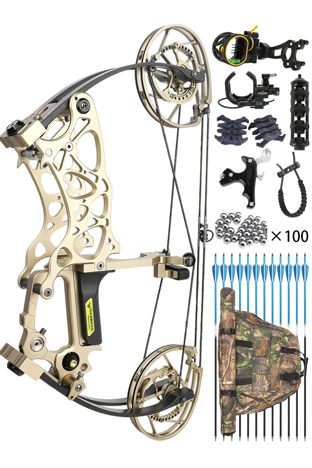• Accessories: 1× Five-pin sight + 1× Arrow Rest + 2×Bow Shock Absorbers + 1×Shock Absorber + 1×Bow Release + 1×Wrist Rope + 100×12mm Steel Balls + 6×Carbon Arrows + 1×Bow Bag