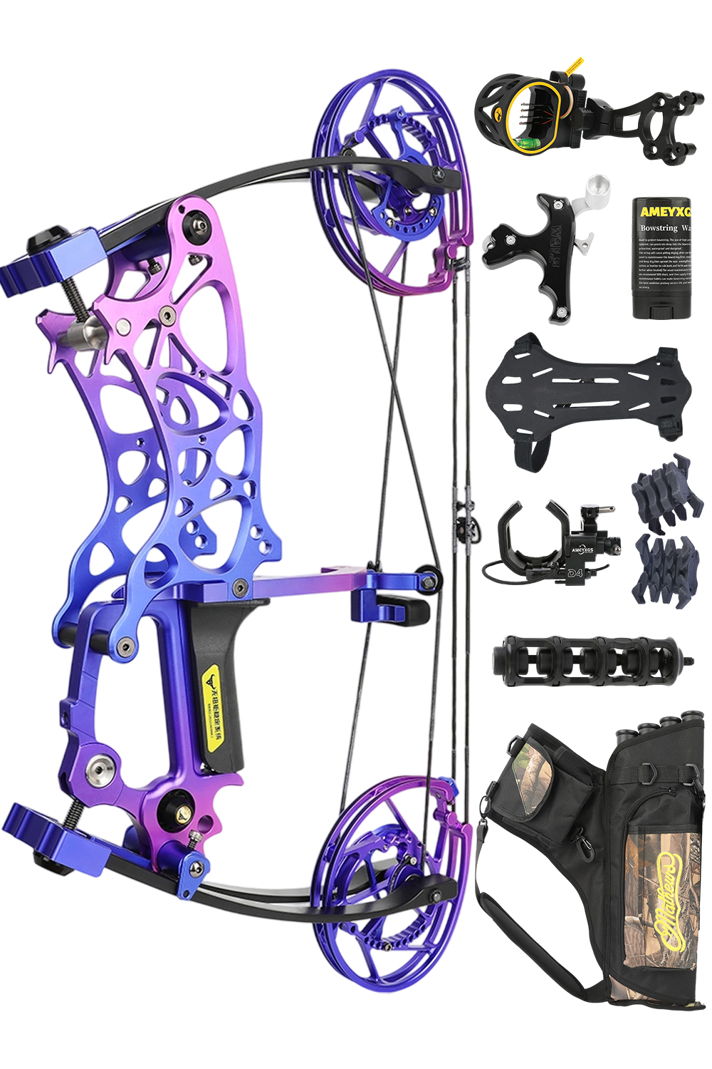 • Accessories: 1× five-pin sight + 1× bow release + 1× string wax + 1× arm guard + 1× arrow rest + 2× bow shock absorbers + 1× Matthews bow bag + 1× shock absorber