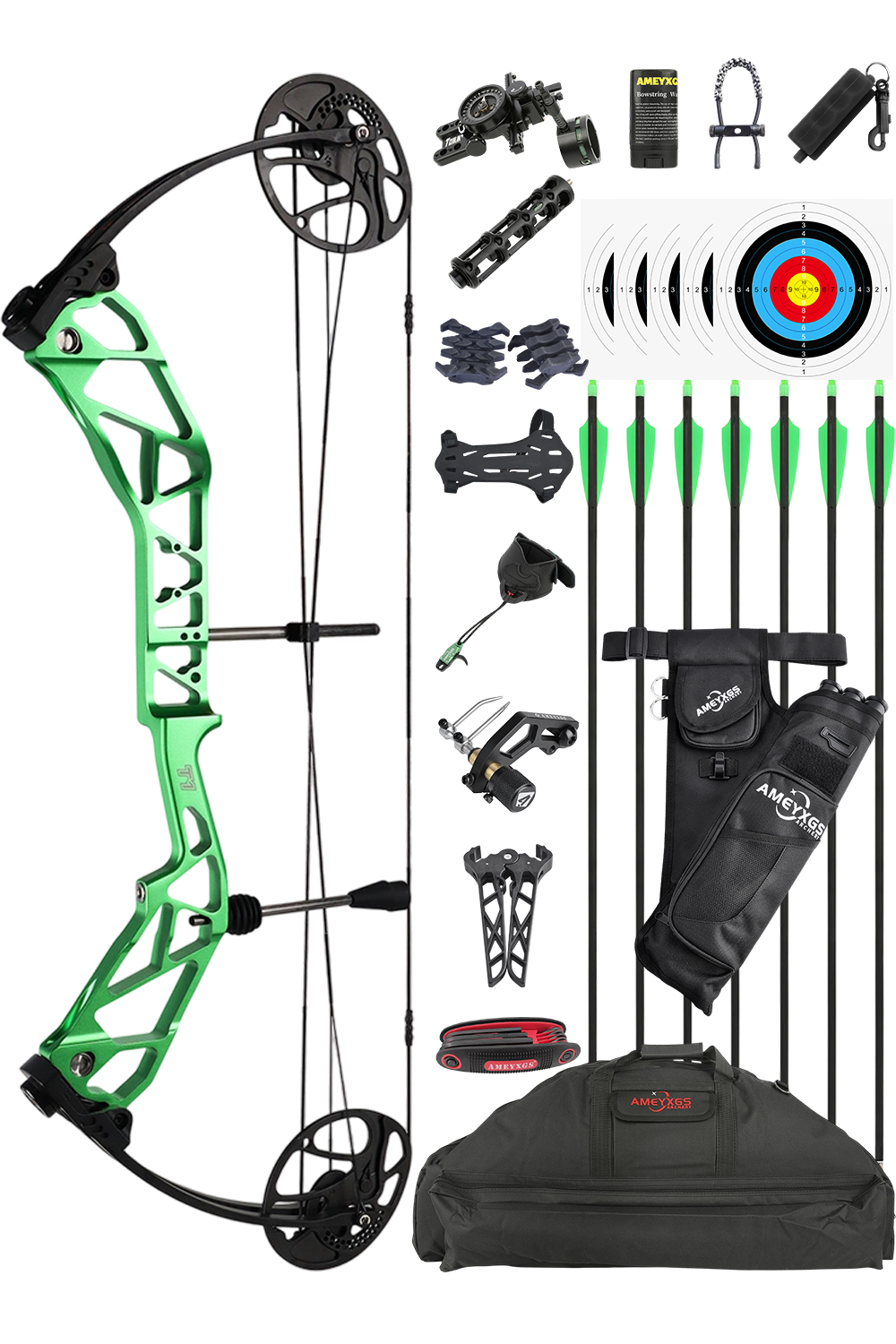 Accessories: 1 x Five pin optical bow sight+1 x Braided bow sling+1 x brush arrow rest+1 x rubber stablizer+1 x bow release+1 x D-loop+1 x Peep sight+2 x limb dampers+1 x Allen keys+1 x string wax+1 x bow stand+1 x 6pc arrow quiver+1 x arrow puller+12x 30”carbon arrow+1 x Soft Carry Bag