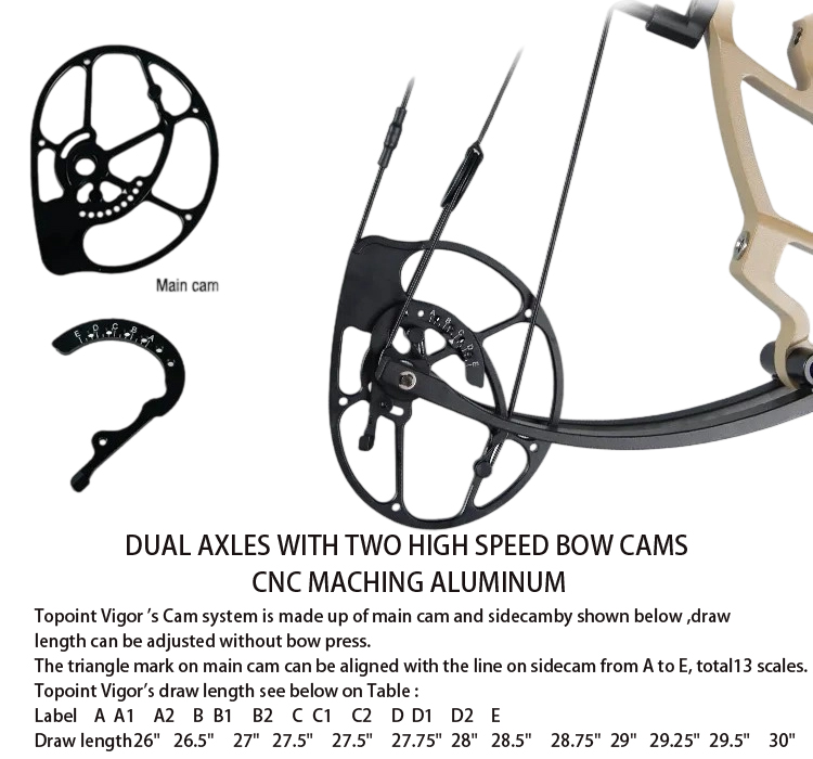 The triangle mark on the main cam can be aligned with the line from A to E on the side cam, with a total of 13 scales, which can easily adjust the Draw Length.