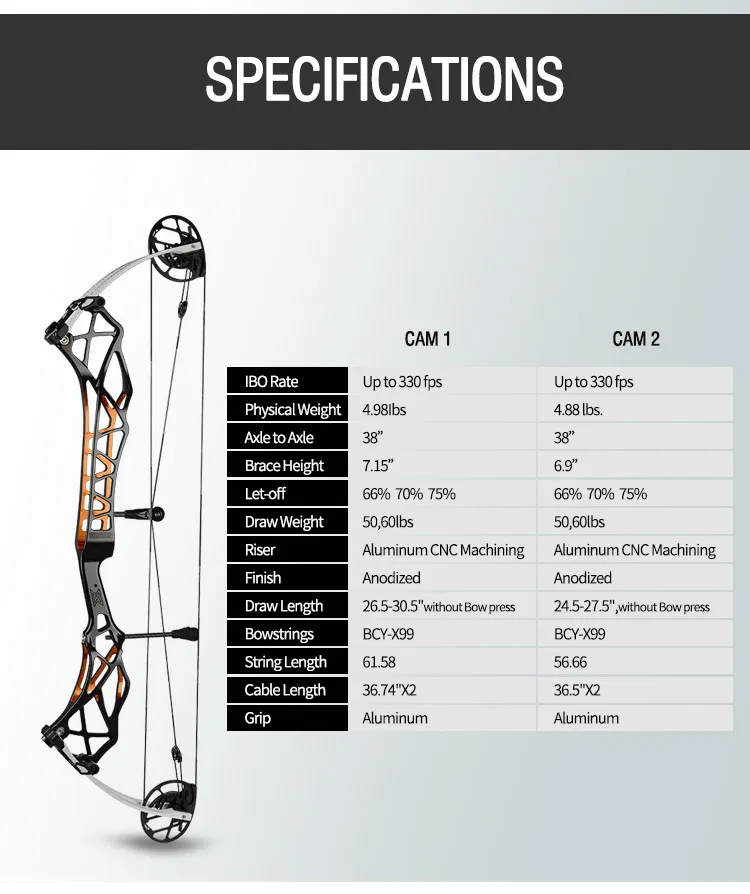 The Cam designed by the famouscompound bow designer in China, this camsystem can adjust the draw lenath withoutbow press,2 kinds of different draw lengthCams can be seleced this can fit almost alldifferent draw lengths' players. Hight speeddesign can help you increase shooting consistency and accuracy.